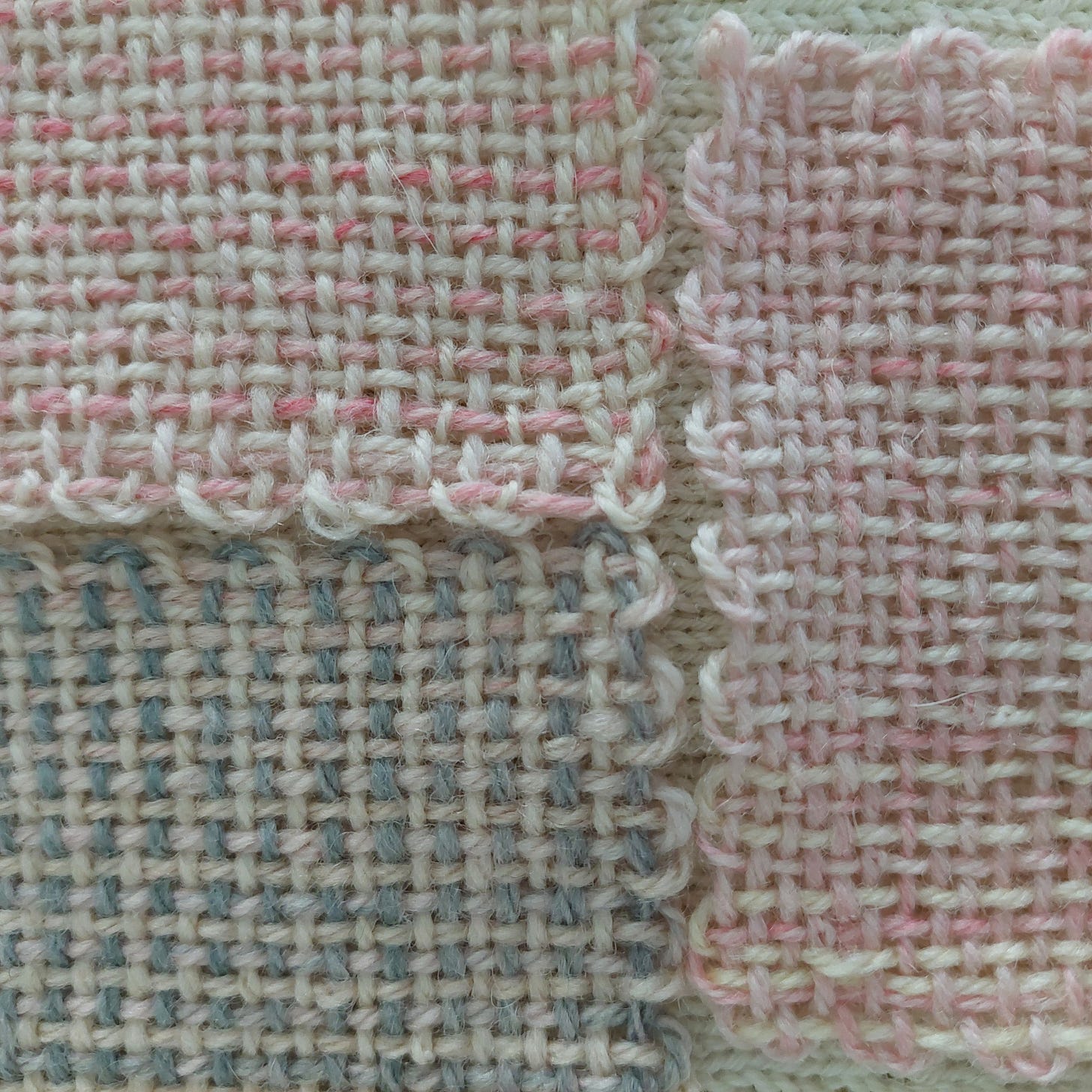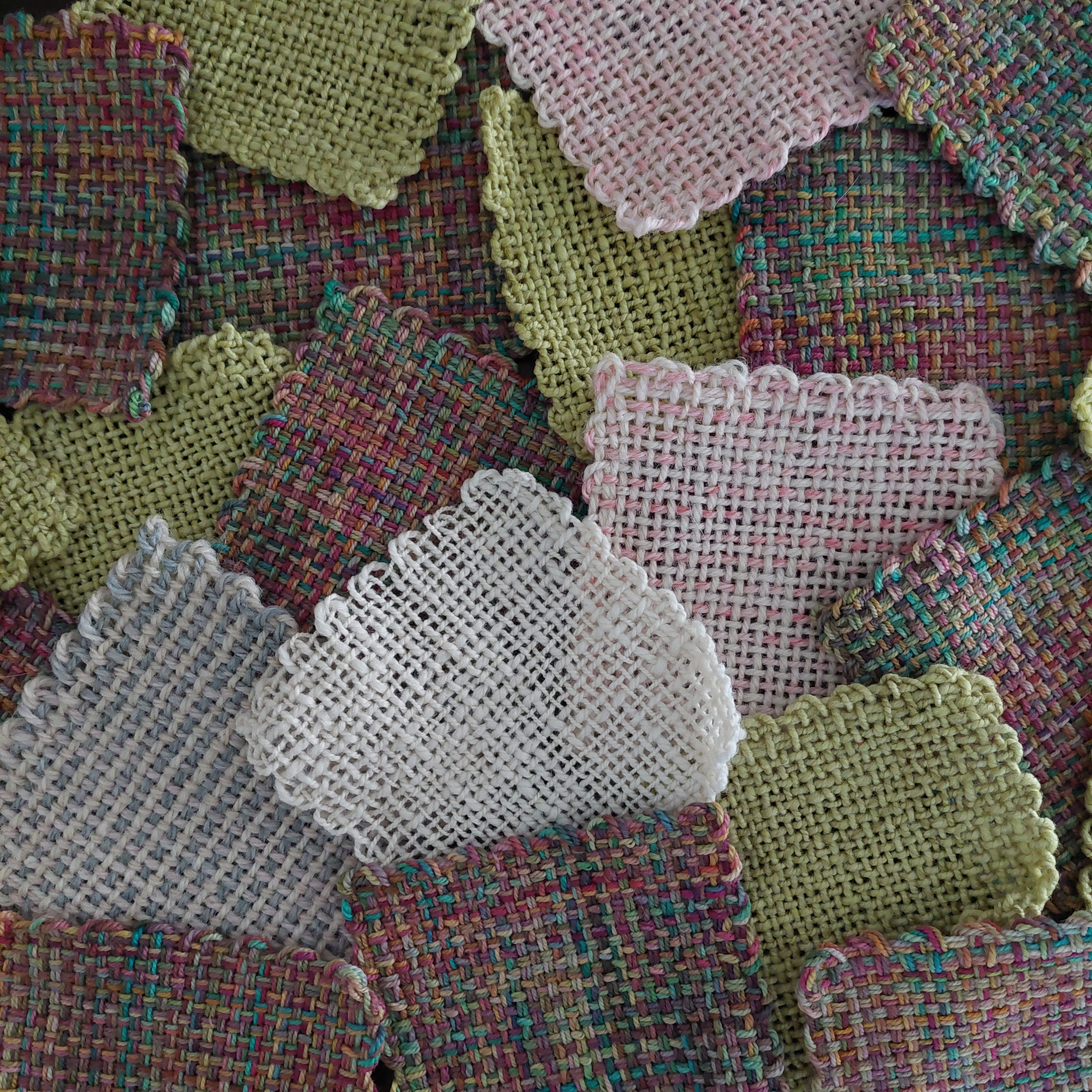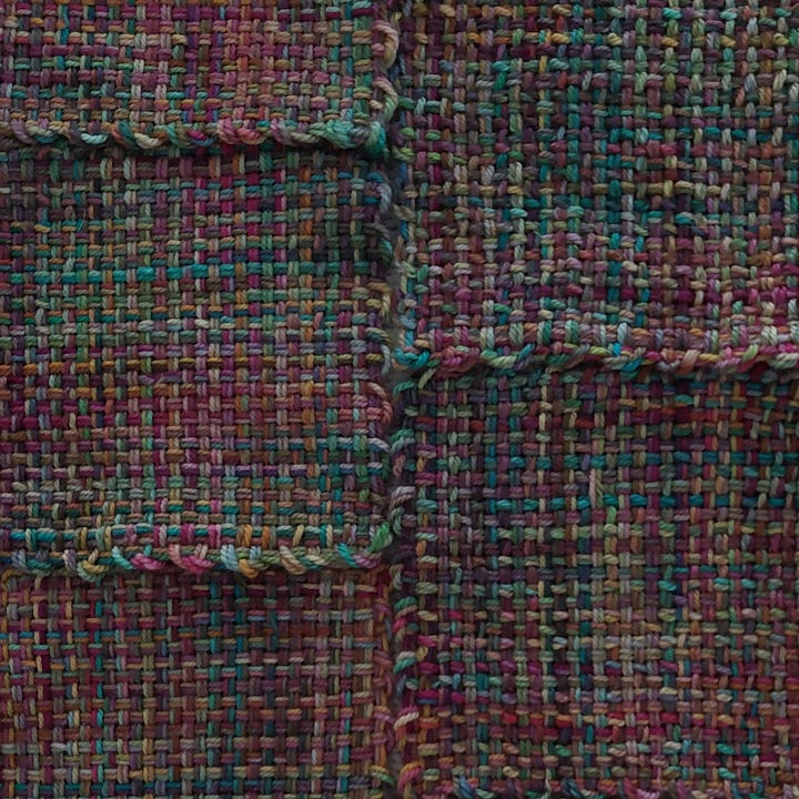 The woven squares I liked the most fabric-wise, were made with DK-weight yarn, so I decided to wind this fingering/sock-weight yarn double. The results are better than I could have ever imagined! By holding the yarn double with itself and the quick color changes, the wovan squares have an almost plaid look to them. All the colors melted together, and I no longer feel overwhelmed by their variety. I’m not sure what I will turn these into, but I now have another tool in my kit for using yarn I already have!