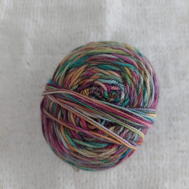 In keeping with my general theme of “using the yarn I already have”, I looked through my yarn for something with no set plans (or unsure ones) and might create a visually interesting project. Even with my experimental outlook, I’m a bit precious about yarn and want to use each bit wisely. I found this skein with no real plans and I had trouble envisioning as a finished object. It was a mystery skein I got a few years ago, and the quick, varied color changes gave me pause for any project other than socks. I have enough yarn that I’m excited to turn into socks that using this elsewhere wouldn’t do any damage.