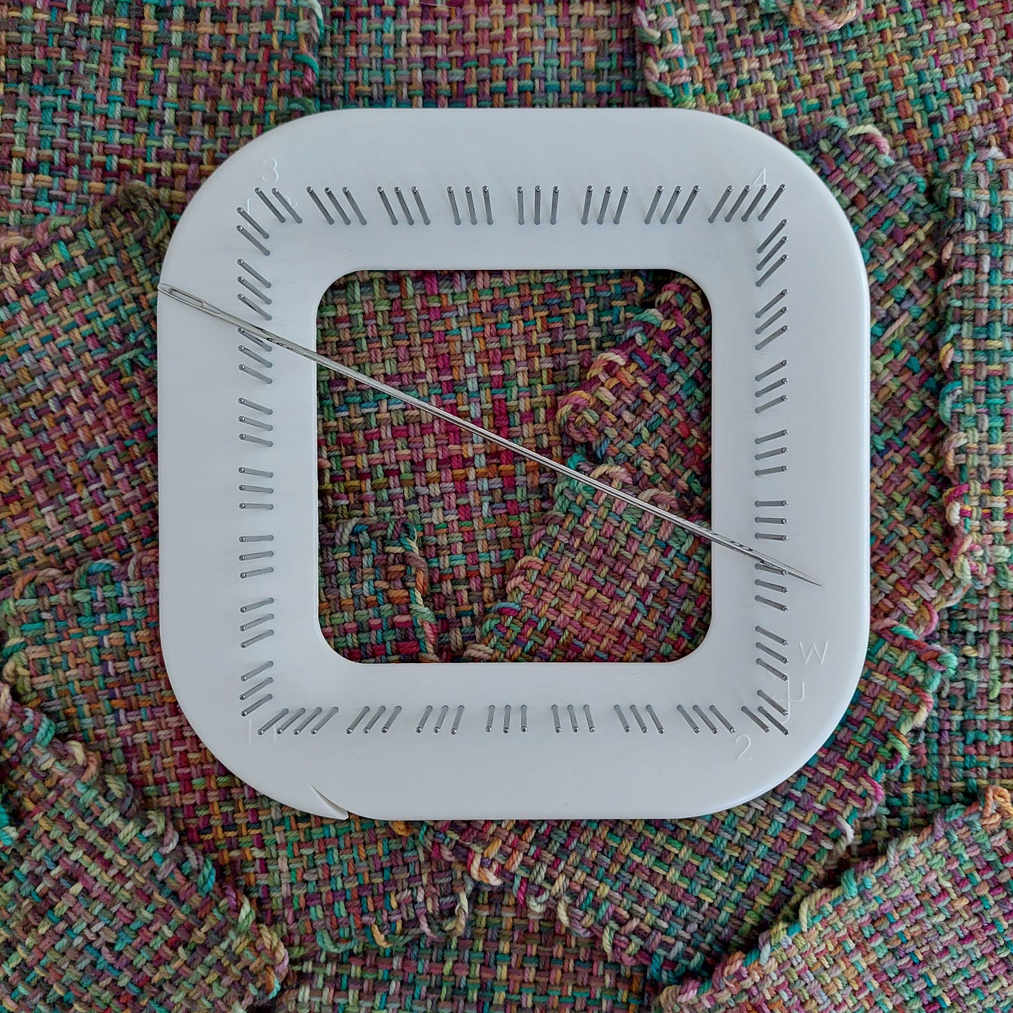 This style of loom is called a pin loom. The 3-pin design shown above was created for increased ease in weaving and popularized by the Weave-It Looms in the 1930s1. It seems that this style of weaving fell out of fashion after the 1960s. What I found most intriguing about the type of loom is that each square uses one continuous length of yarn (about 8 yards / 7.25 meters), meaning that there are only two ends to weave in. And once you’ve done that, you can pull it straight off the loom! Now that’s my kind of easy finish!