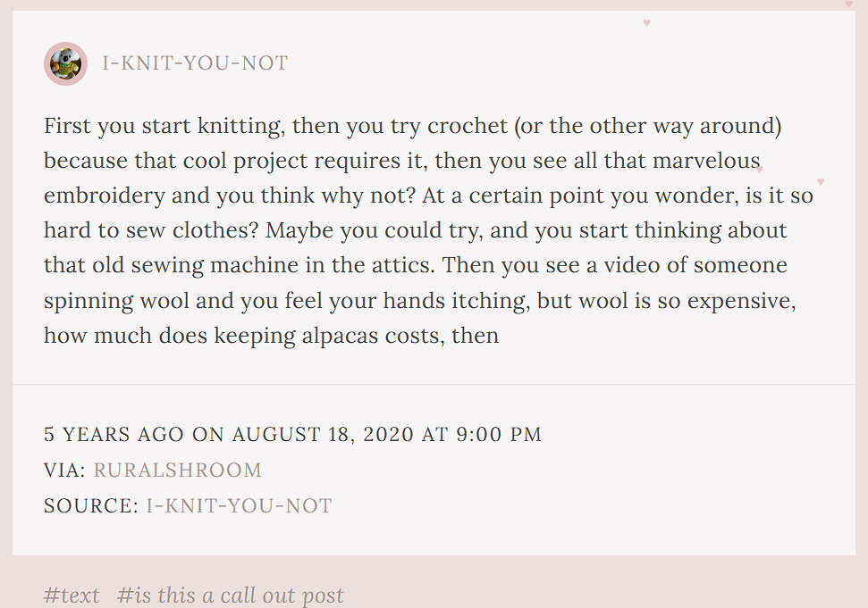 As you may have noticed by now, my list of hobbies is overflowing with fiber-related crafts, but that has not stopped me from adding another to my repertoire. It can all be summarized by this amusing text post from Tumblr (see below) that outlines the fiber artist’s predicament: